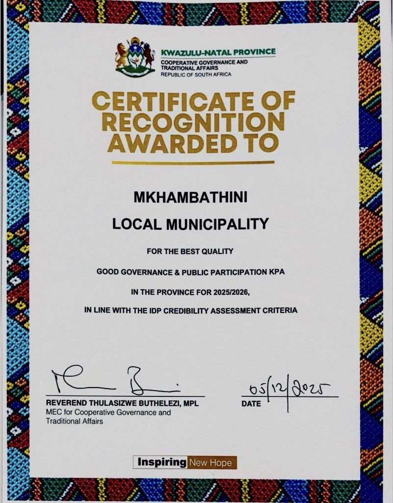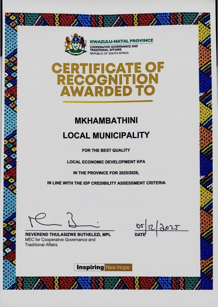 We are elated at the recognition received that places our intergrated Development Plan (IDP) at number 8 out of 54 municipalities in KZN. We were awarded by the KZN Cooperative Governance and Traditional Affairs, in the following key performance areas in the 2025/2026 IDP cycle year: